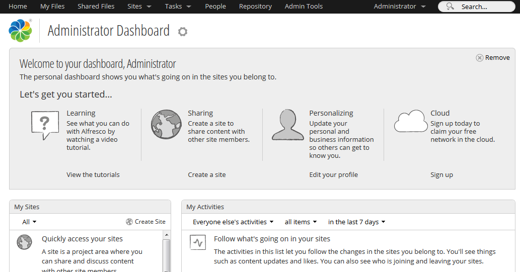 Open the Alfresco page at http://192.168.197.130:8080/share and login using default username “admin” with specified password during the installation process. You should see the Alfresco dashboard similar to the screenshot below: