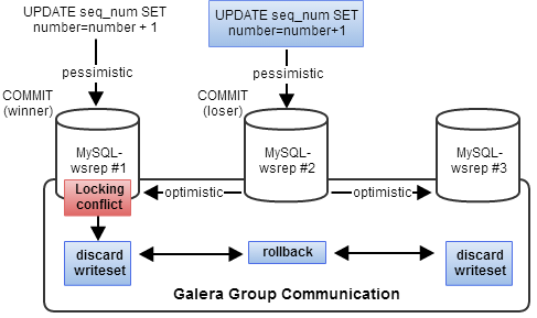On the originator node, it can obtain all of the necessary locks for the transaction, but it has no idea about the rest of the cluster. So, it optimistically sends the transaction (aka writeset) out to all the other nodes to see if they will commit.