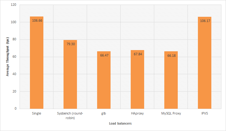 From the graph, we can see that IPVS (Keepalived) is the clear winner and has the slightest overhead since it runs in kernel level and mainly just routes packets. Keepalived is a userspace program to do health checks and manage the kernel interface to LVS. HAproxy, glb and MySQL proxy which operates on the higher layer performs ~40% slower than IPVS and 25% slower as compared to Sysbench round robin, as shown in the chart below: