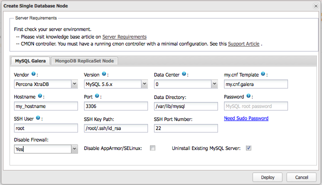 Deployment of single-node MySQL, MariaDB and MongoDB: It is now possible to deploy single database nodes from ClusterControl. Once a single node is deployed, it can then be managed from the ClusterControl interface. Single nodes can be scaled into clusters with a single click of a button. MySQL and MariaDB are turned into Galera Clusters, and MongoDB into a ReplicaSet. So you can now start small, and easily add scalability/HA when the business or your development/test environment requires it.