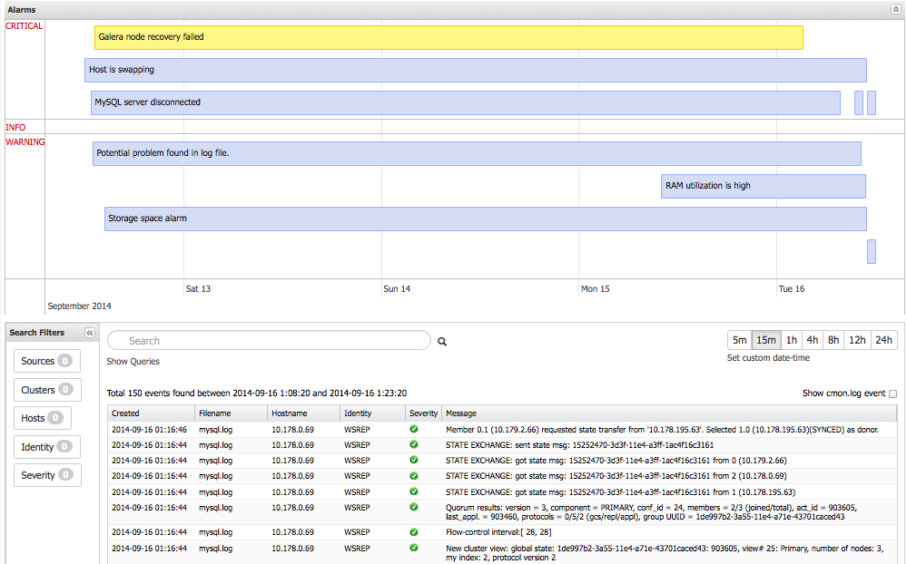 Flexible Alarm/Email Notification System: ClusterControl now includes a user-configurable events and alarms subsystem. This subsystem tracks events happening in different areas e.g. problems related to
