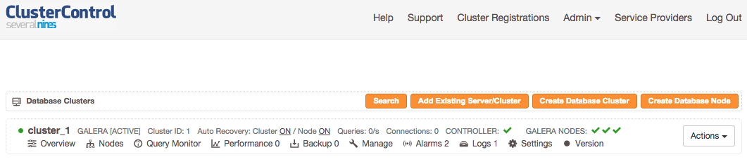 Click ‘Add Cluster’ and monitor the output of cluster jobs. Once done, you should able to see the Galera Cluster listed: