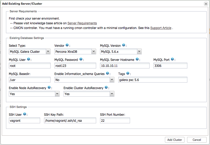 Our Vagrantfile deploys 4 instances on VirtualBox platform, three for Galera nodes plus one for ClusterControl. It requires the following Vagrant boxes available on our site: