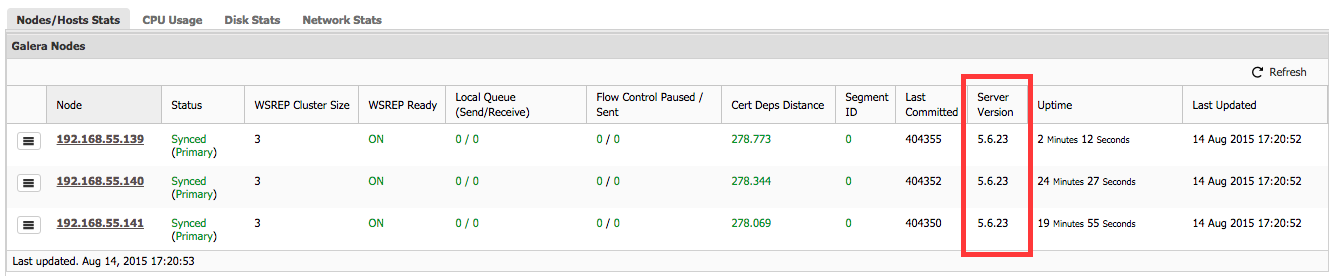 Wait until the last node joins the cluster and verify the status and version from the ClusterControl Overview tab: