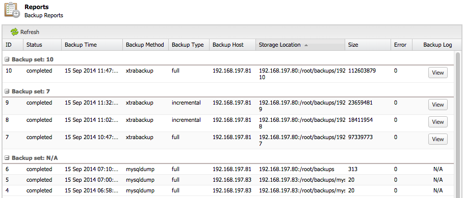 ClusterControl manages incremental backups, and groups the combination of full and incremental backups in a backup set. A backup set has an ID based on the latest full backup ID. All incremental backups after a full backup will be part of the same backup set, as seen in the screenshot below: