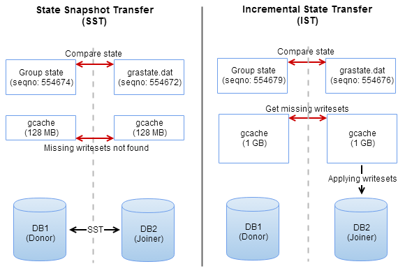 When a Galera node rejoins the cluster, it will check the local gcache to determine whether it needs to perform incremental state transfer (IST) or state snapshot transfer (SST). It will calculate the gap between group state and the local state stored in grastate.dat. If all of the writesets that it missed can be found in the donor’s gcache, it will perform IST by getting the missing writesets and catch up with the group by replaying them. This is faster than SST, and non-blocking on the donor side.