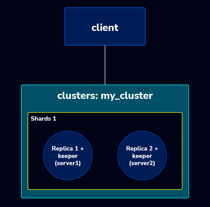 The ClickHouse cluster is currently running with 1 shard and 2 replicas. We’ll beef this up to a 2-shard setup, and maintain a 1:1 shard to replica ratio . The new cluster topology will look like this: