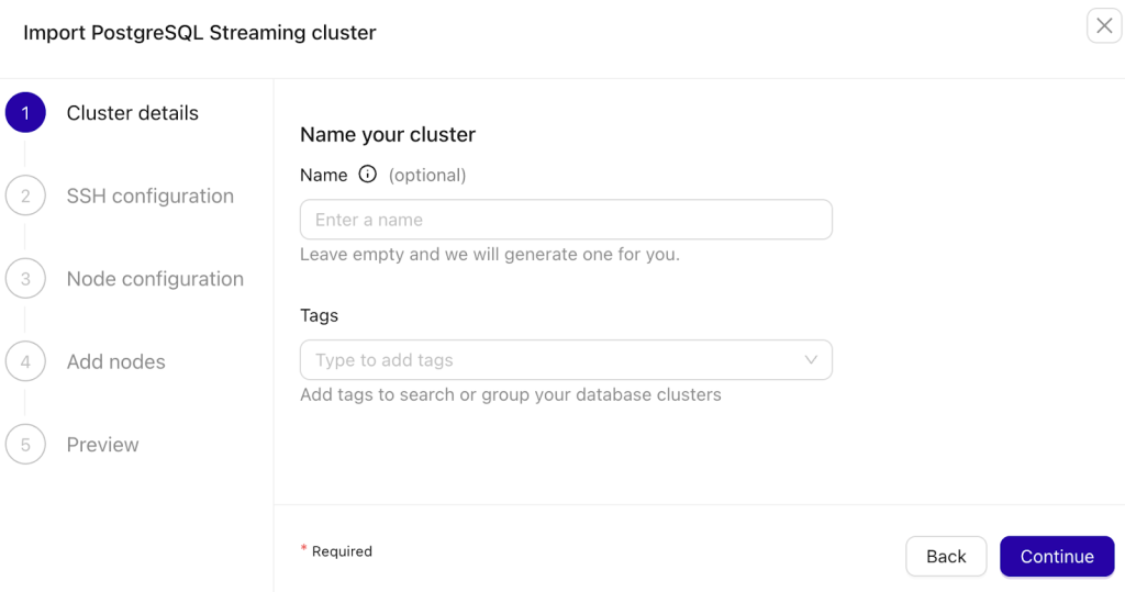 Now select “Import a database cluster” and choose your database technology. In the next step, you can specify a name for your cluster and tags.