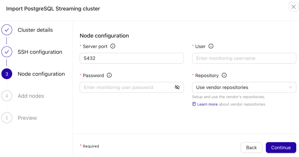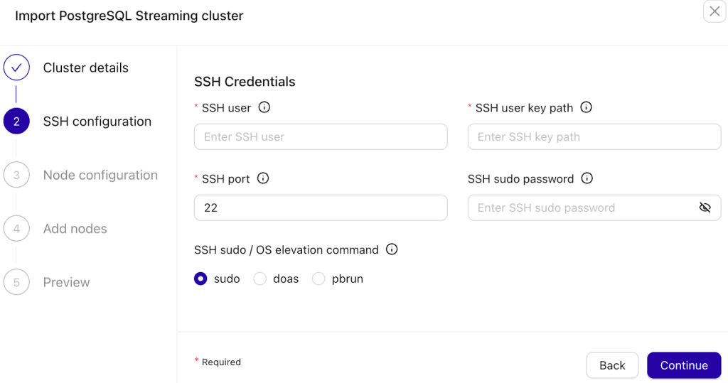Then, add the SSH information to access your database nodes. The SSH user can be root or any user with sudo/doas/pbrun privileges.